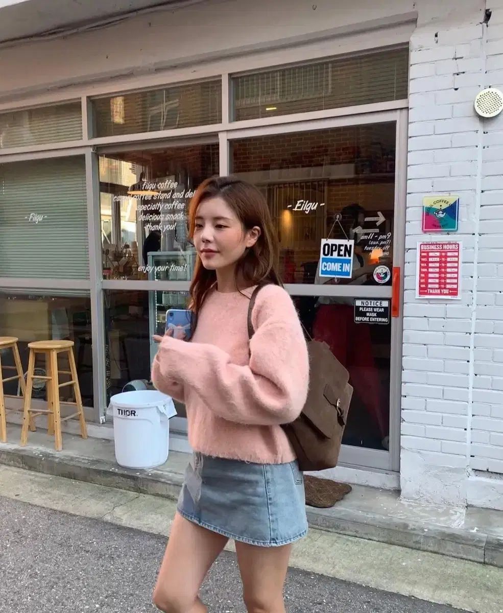 骨盤に少しひっかけて着るミニ丈デニムスカートで、90年代特有の骨盤スカートの感じをヒップに発展させました。Aラインシルエットでレッグラインが長くスリムに見える効果があります。