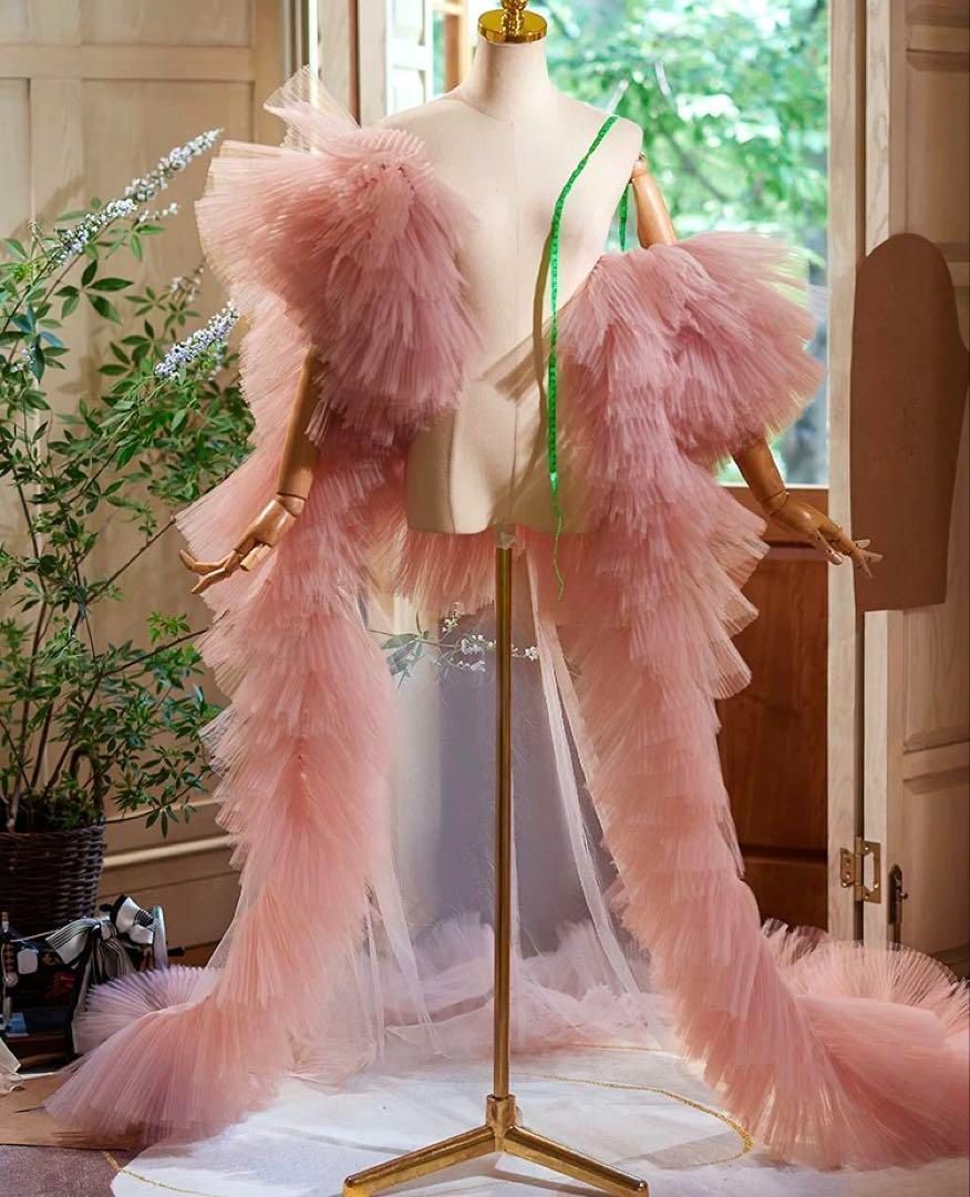 25年 フリルスリーブのゴージャスなロングショール ピンクベージュ