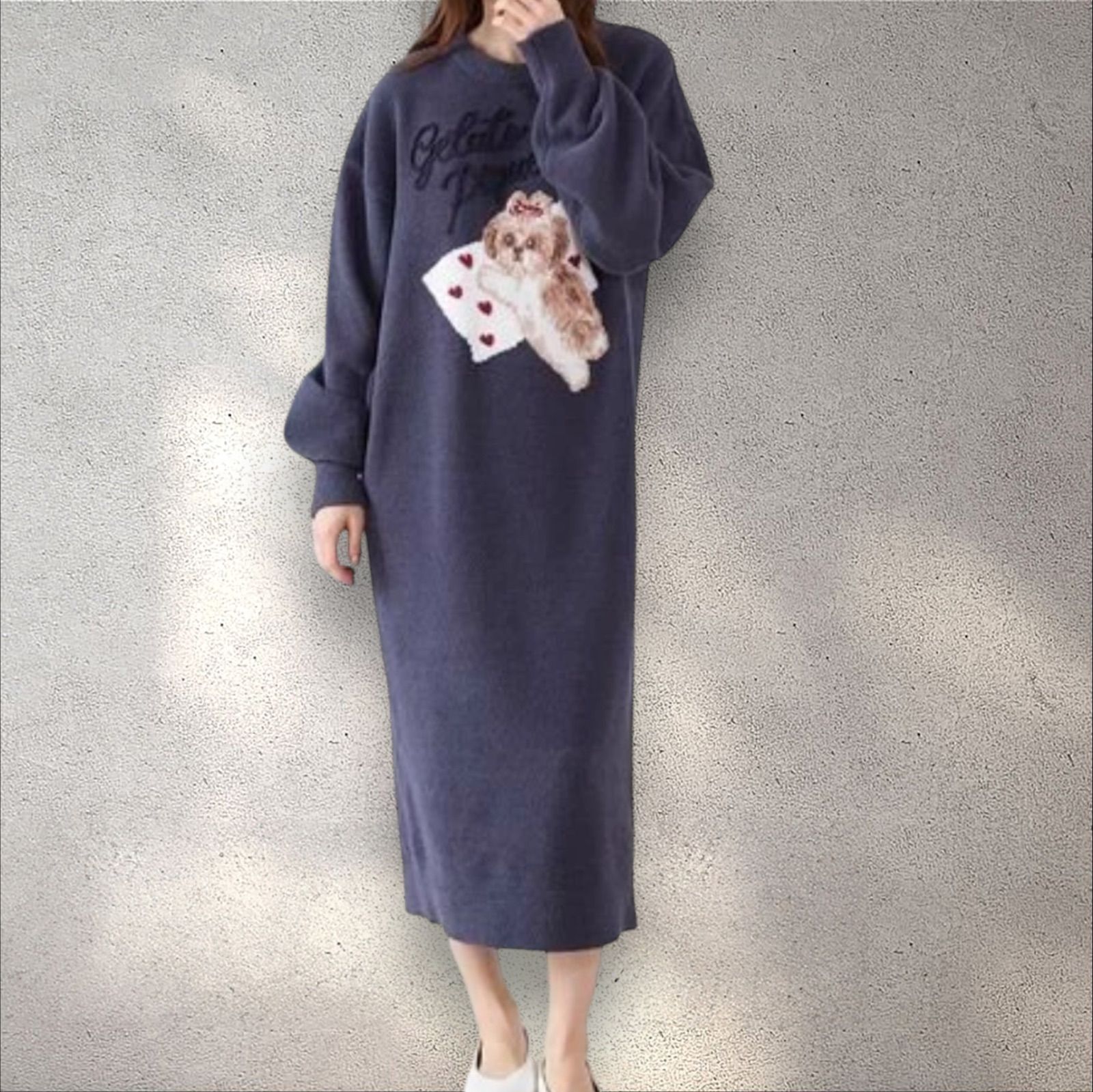 お気に入りの枕に寄り添うシーズー犬に癒される、ジャガードニットのシリーズです。ふんわりした風合いの絵柄に、ぷっくり立体的なロゴをあしらったワンピース。1枚で楽に着用いただけて、ボリューミーな袖もおしゃれな1枚です。リボンを付けたシーズーの絵柄は、ボディの配色によって枕の柄が異なるのもポイント。ONLINE限定色のネイビーは枕がハート柄になっています。シーズー好きの方へのギフトにもおすすめ!